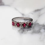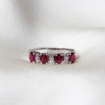 Anillo de oro amarillo o blanco de 14k con 4 rubíes de 0.75 ct. y 9 diamantes de 0.043 ct.