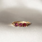 El anillo Mía con 3 piedras semipreciosas, y está montado en oro amarillo de 14k.